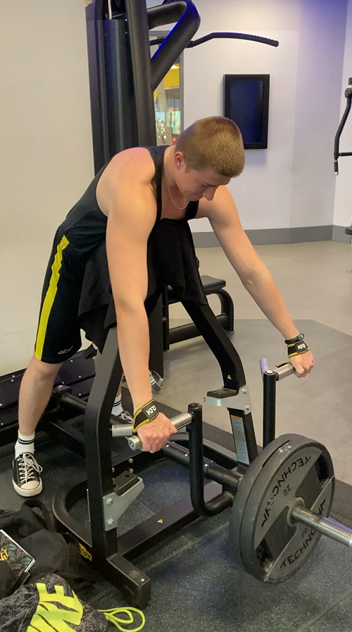 Pierwsze ćwiczenie to wiosłowanie na sztandze T-bar szerokim chwytem. Kluczowe jest tutaj utrzymanie kąta pod pachą na poziomie około 60-75 stopni. Podczas ruchu ważna jest retrakcja łopatek – to jedna z funkcji mięśnia czworobocznego (części środkowej).