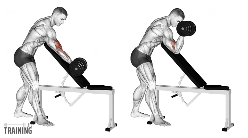 Preacher Curl (lub modlitewnik) – Ćwiczenie przepracuje biceps w skróconej pozycji jednak największy opór będzie w dużym rozciągnięciu bicepsa (gdzie biceps ma dużo lepszą dźwignię niż pozostałe zginacze łokcia), dlatego najlepiej wykonywać je z wolnymi ciężarami zamiast na maszynie.